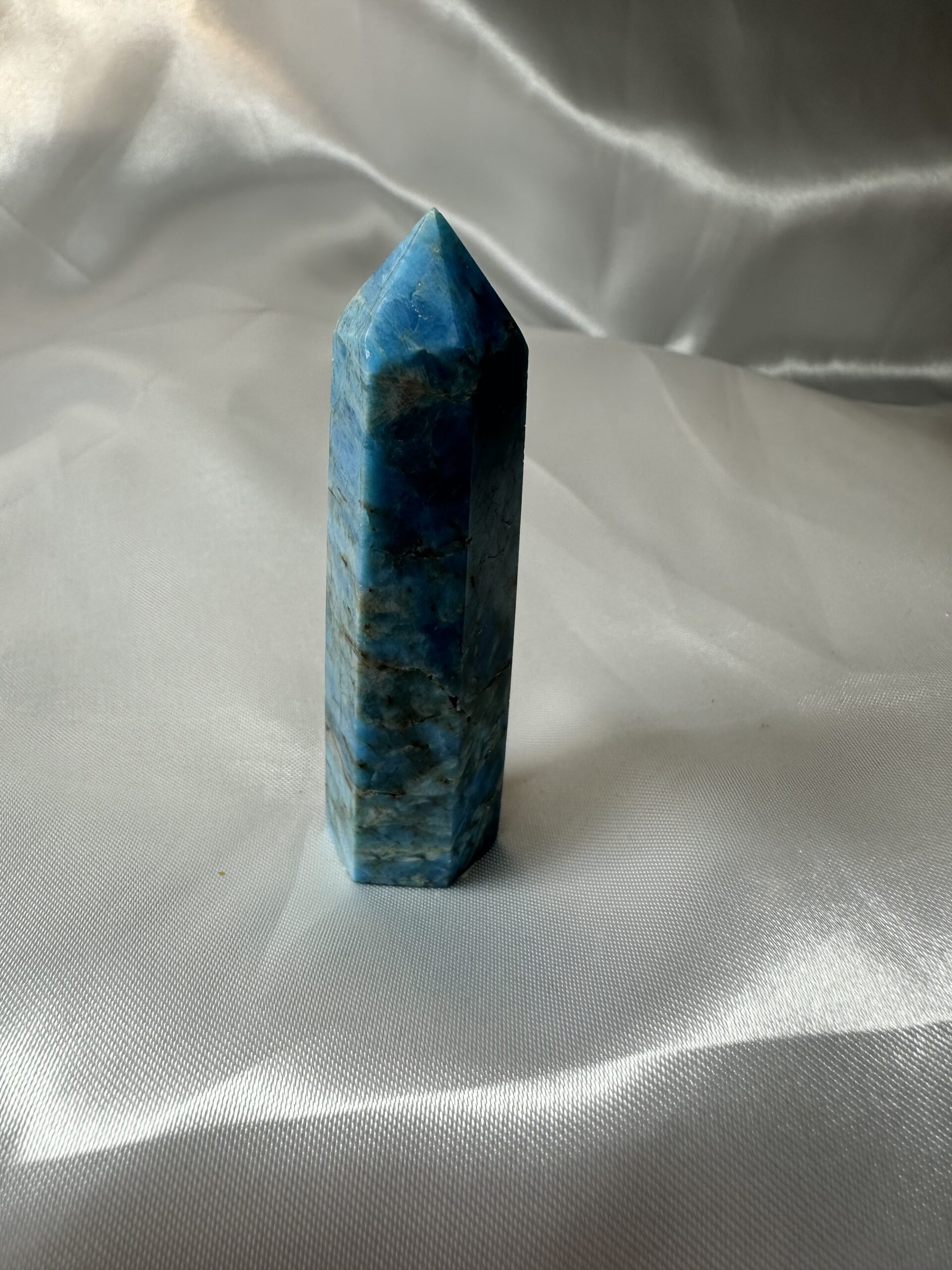 Blue Apatite Tower has the properties of preventing mental exhaustion and the restoration of peaceful balance. The enhancement of communication, self-acceptance, and spiritual growth. The promotion of a love of life, easy friendships, and positive thoughts.