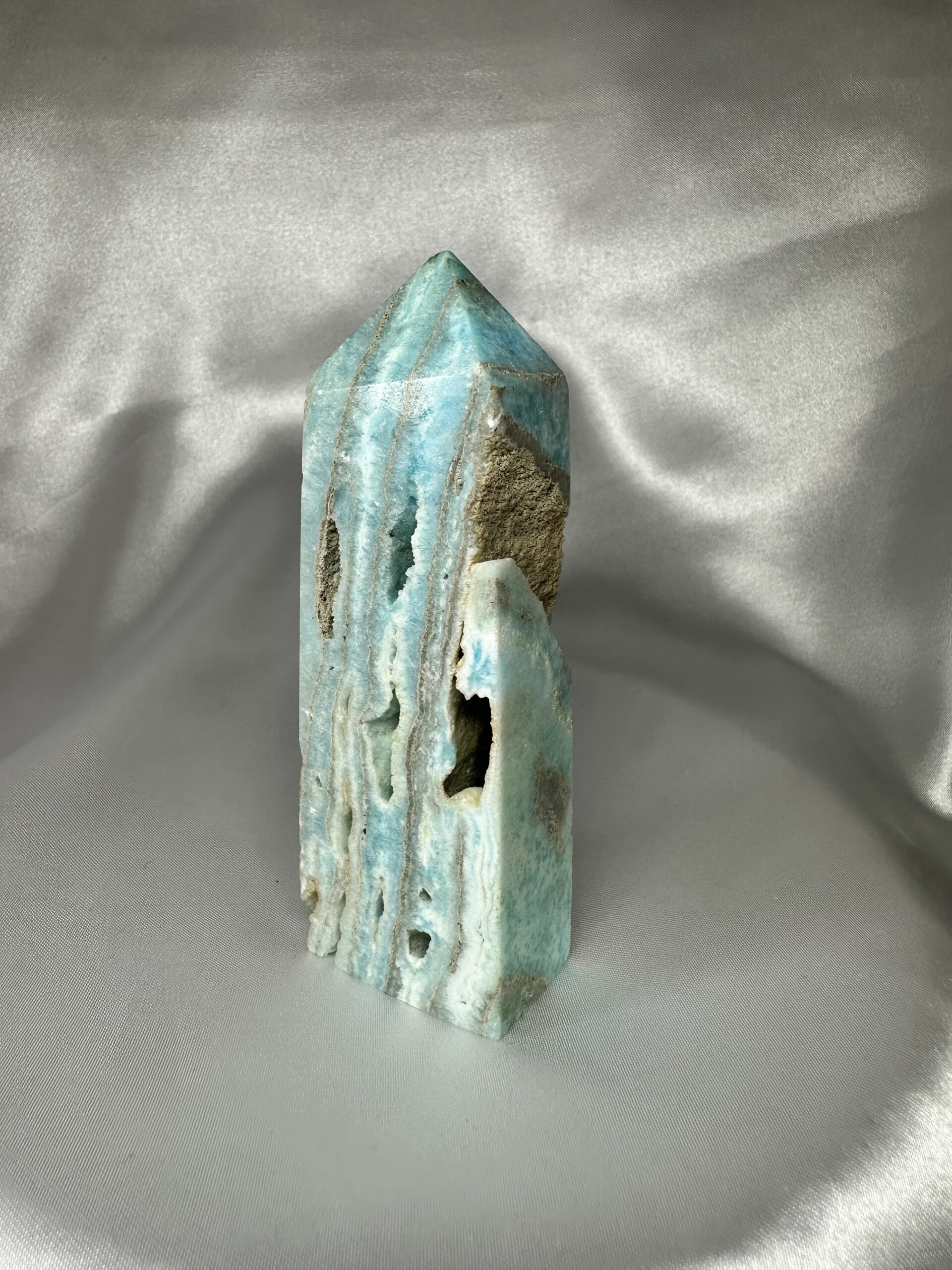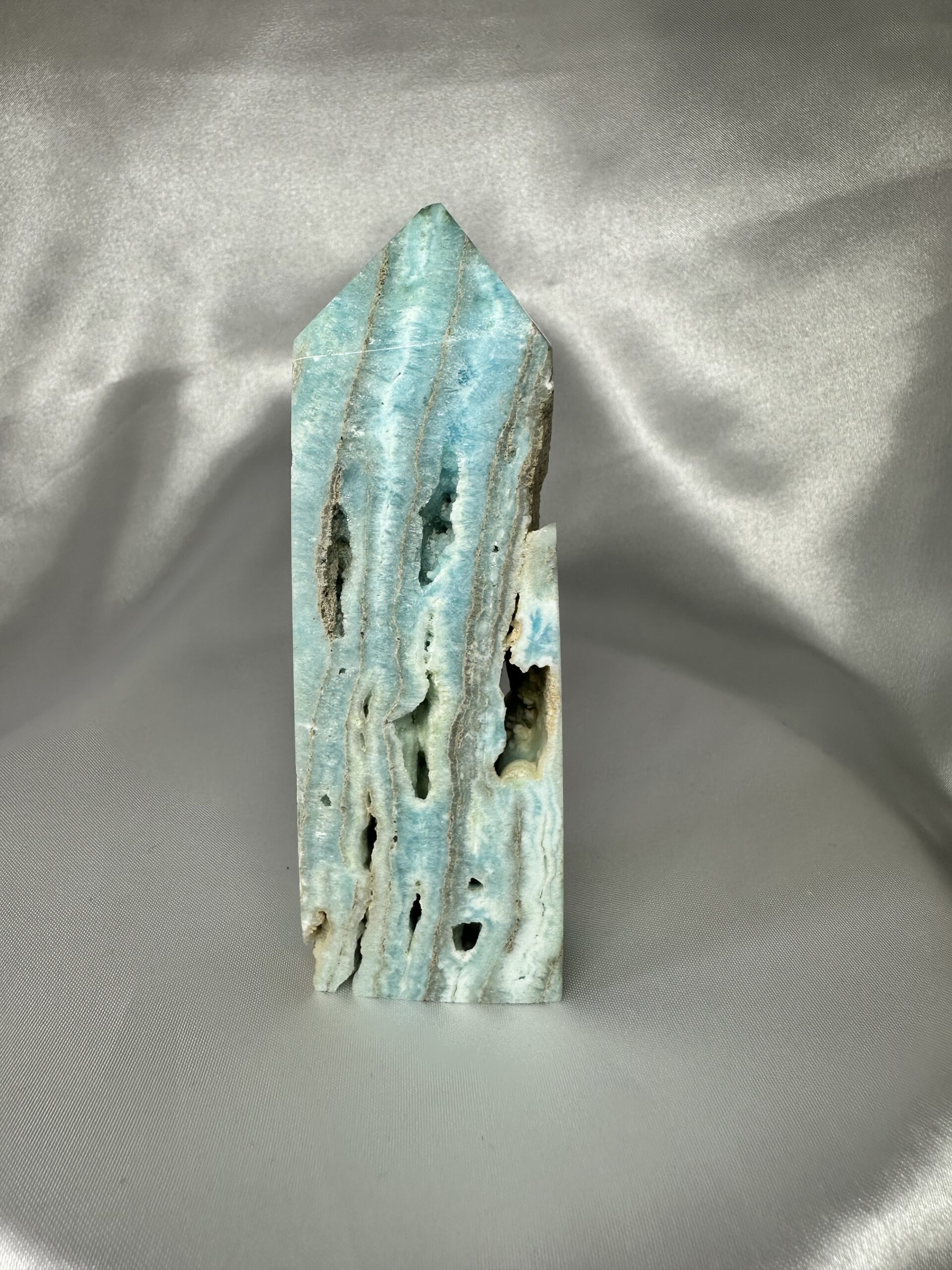 Blue Aragonite Tower is a healing crystal with many benefits for the body, mind, and spirit. It can help release stress and anxiety, promote peace and calm, encourage positive thinking, and improve communication skills.