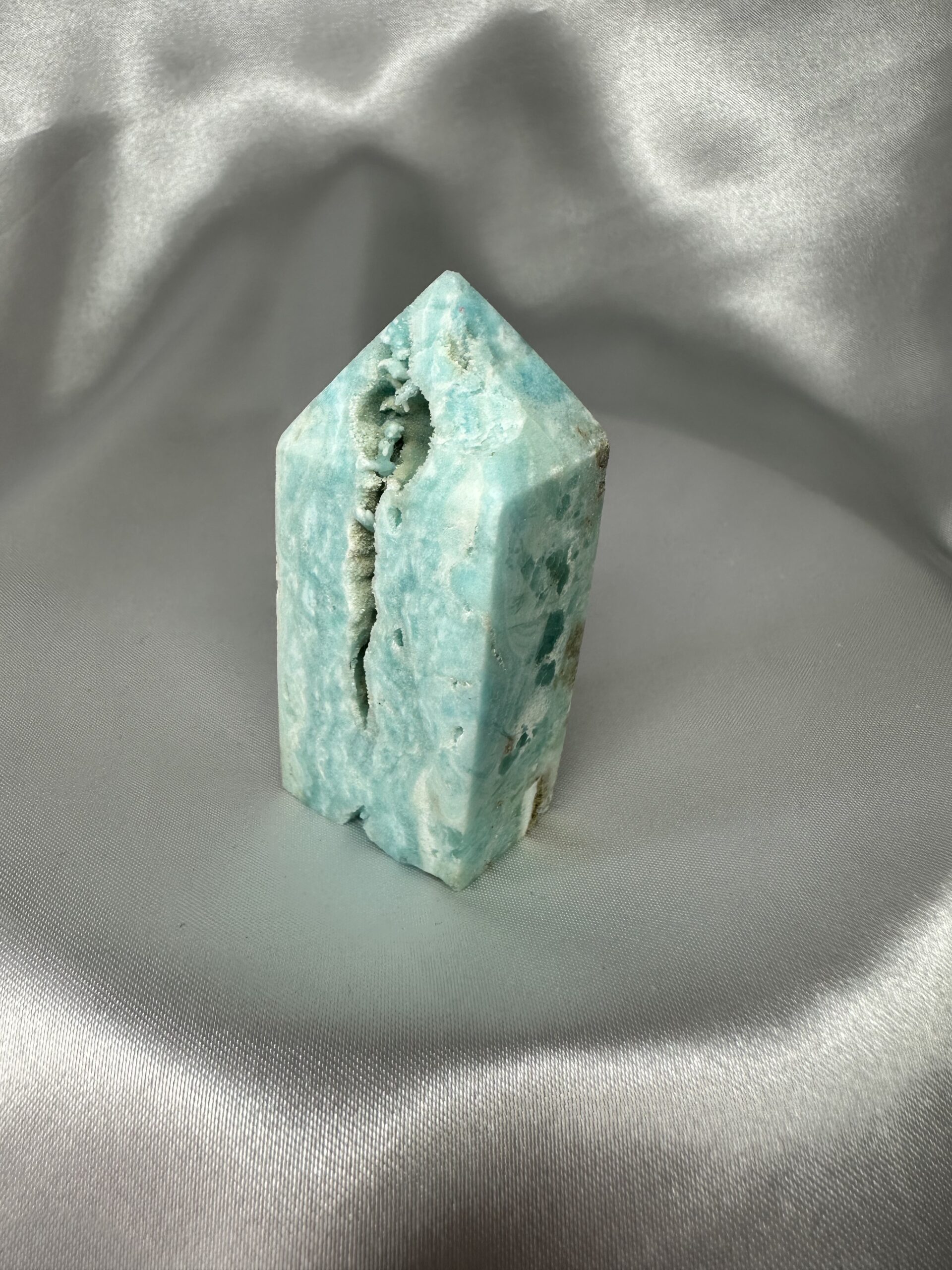 Blue Aragonite Tower is a healing crystal with many benefits for the body, mind, and spirit. It can help release stress and anxiety, promote peace and calm, encourage positive thinking, and improve communication skills.