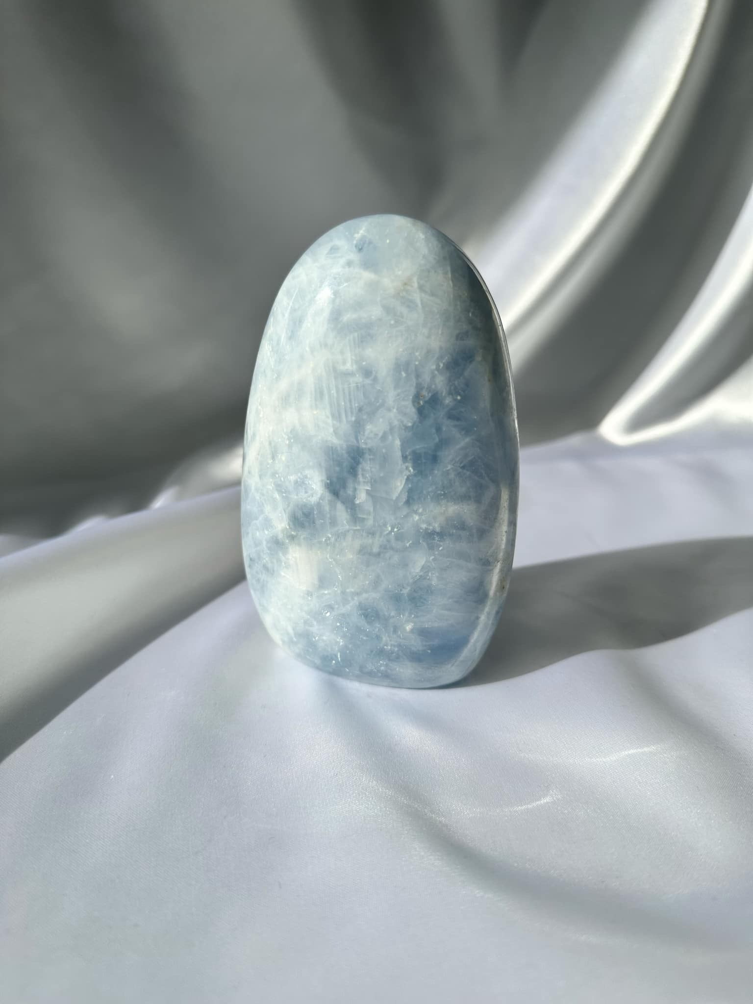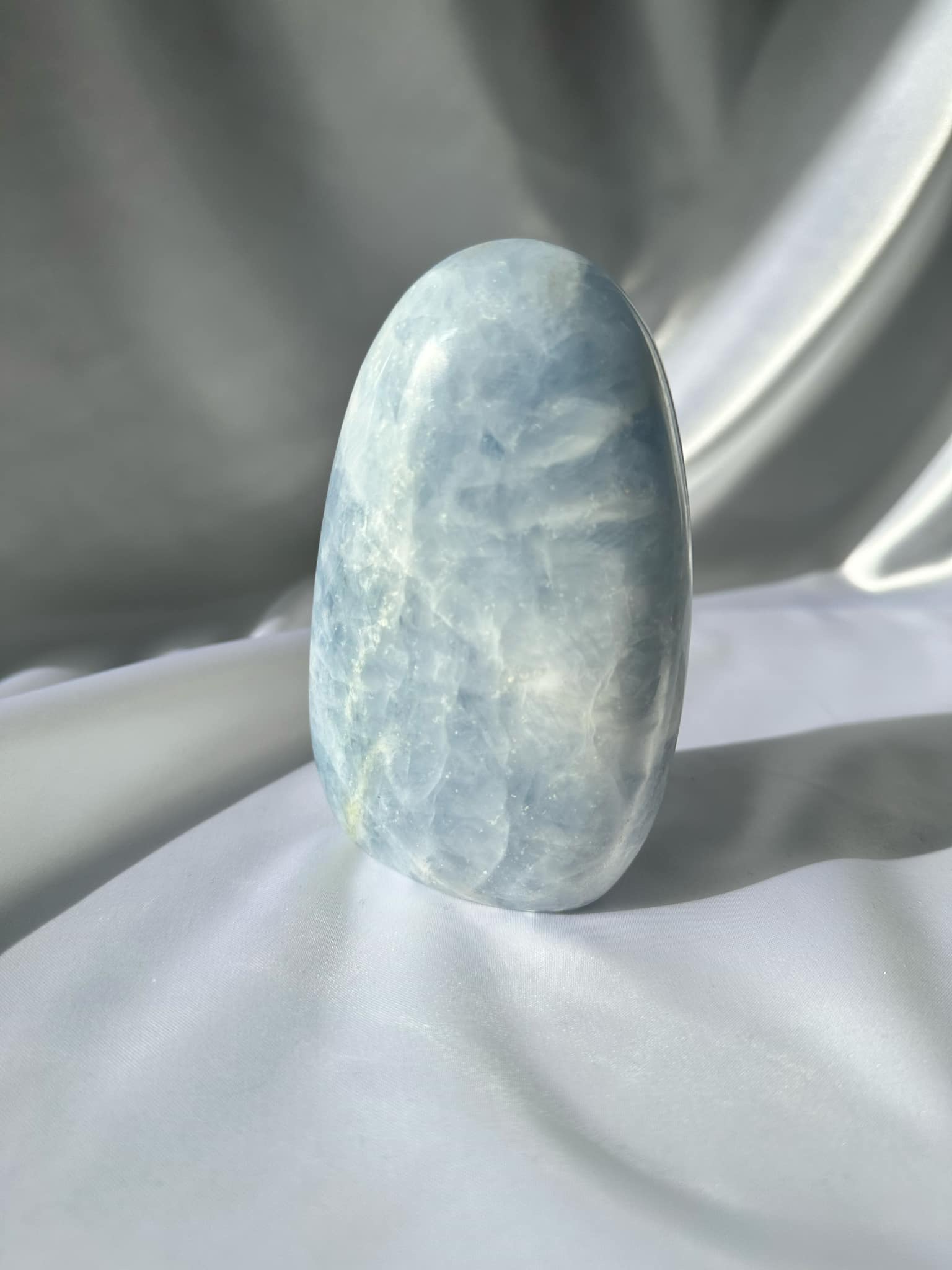 Blue Calcite Freeform offers emotional healing and stress reduction. It acts as a sponge, absorbing negative energy and transforming it into positive energy. This crystal enhances communication between thoughts and feelings. Stimulates creative energies and strengthens dream work.