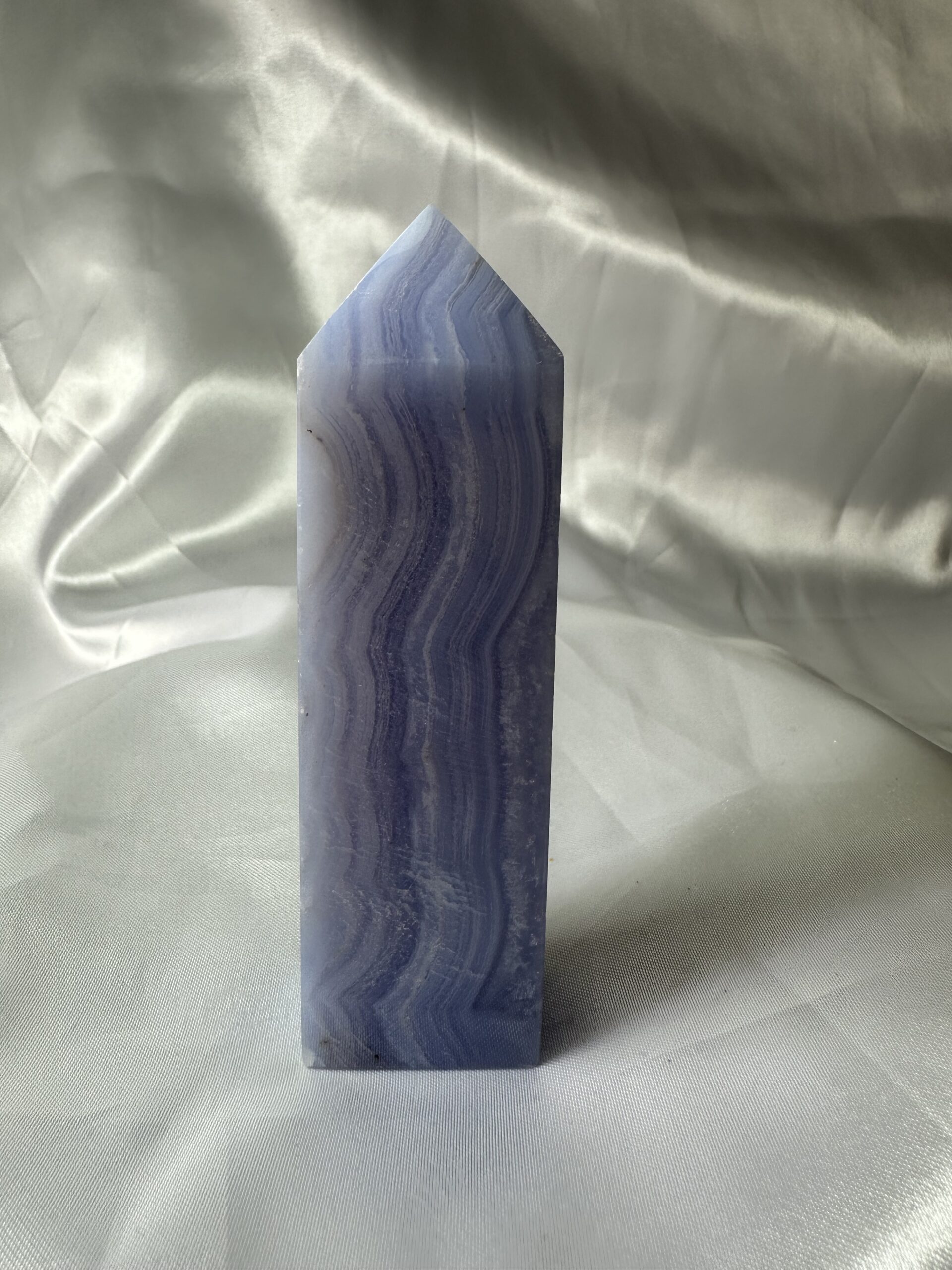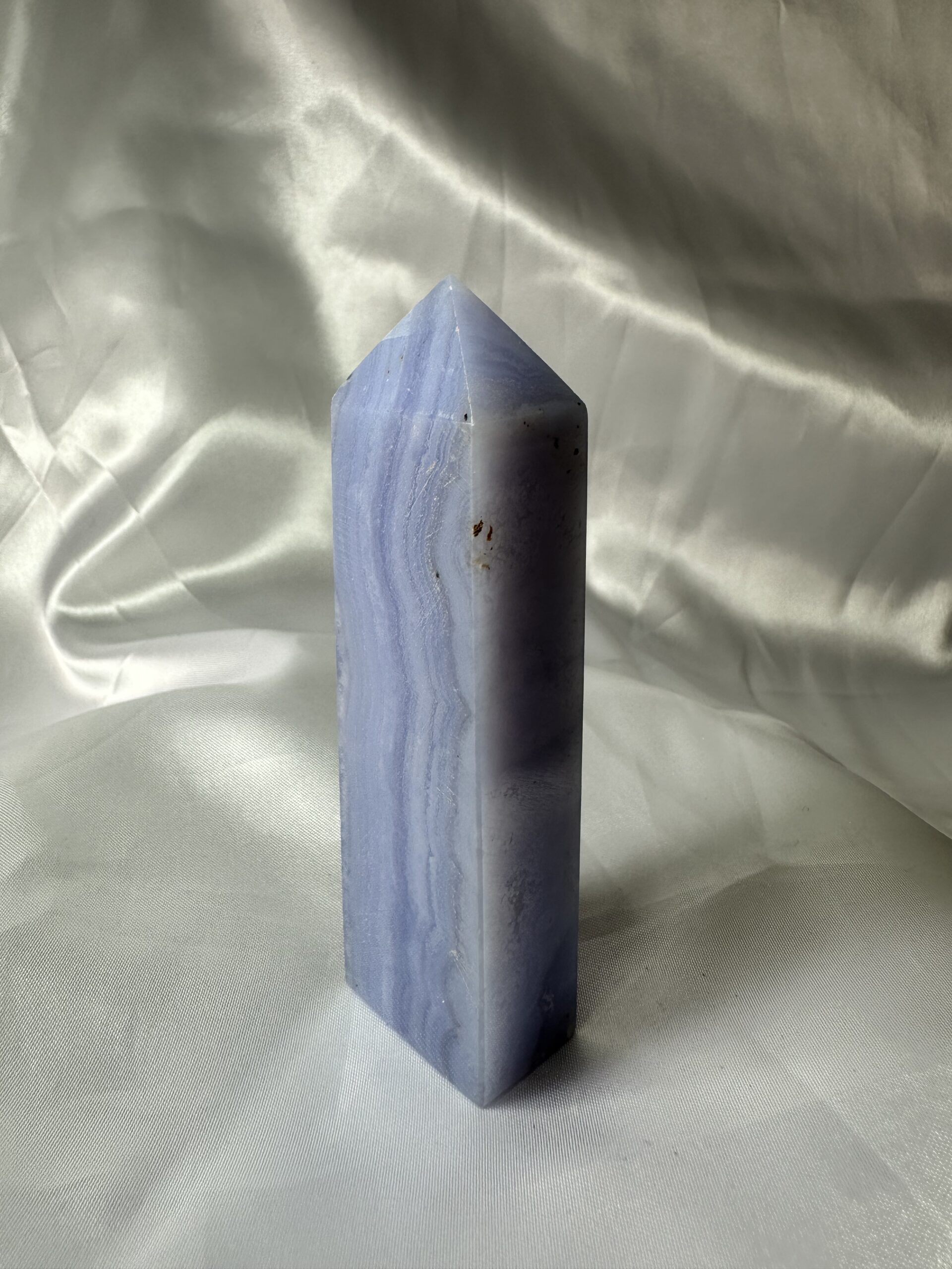 Blue Lace Agate Tower inspires loyalty and trustworthiness. Overcomes communication difficulties. Assists in all forms of communication. Removes anxiety, desperation, and loneliness. Instills hope and joy.