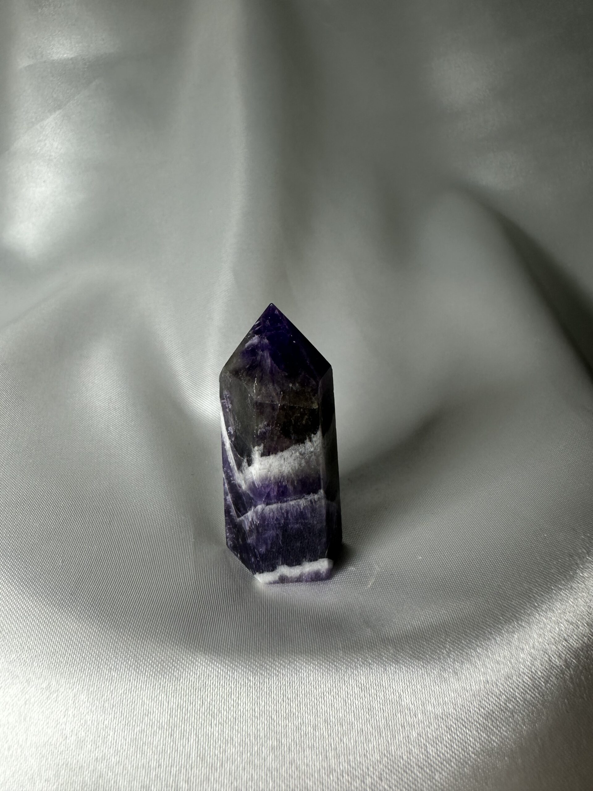 Chevron Amethyst Tower’s healing properties draw upon the stone’s strong attunement to the third eye and crown chakras. It’s energies soothe the mind, promoting spiritual awareness and psychic development. It is also a stone of protection, cleansing your aura and transmuting negative energy into positive.