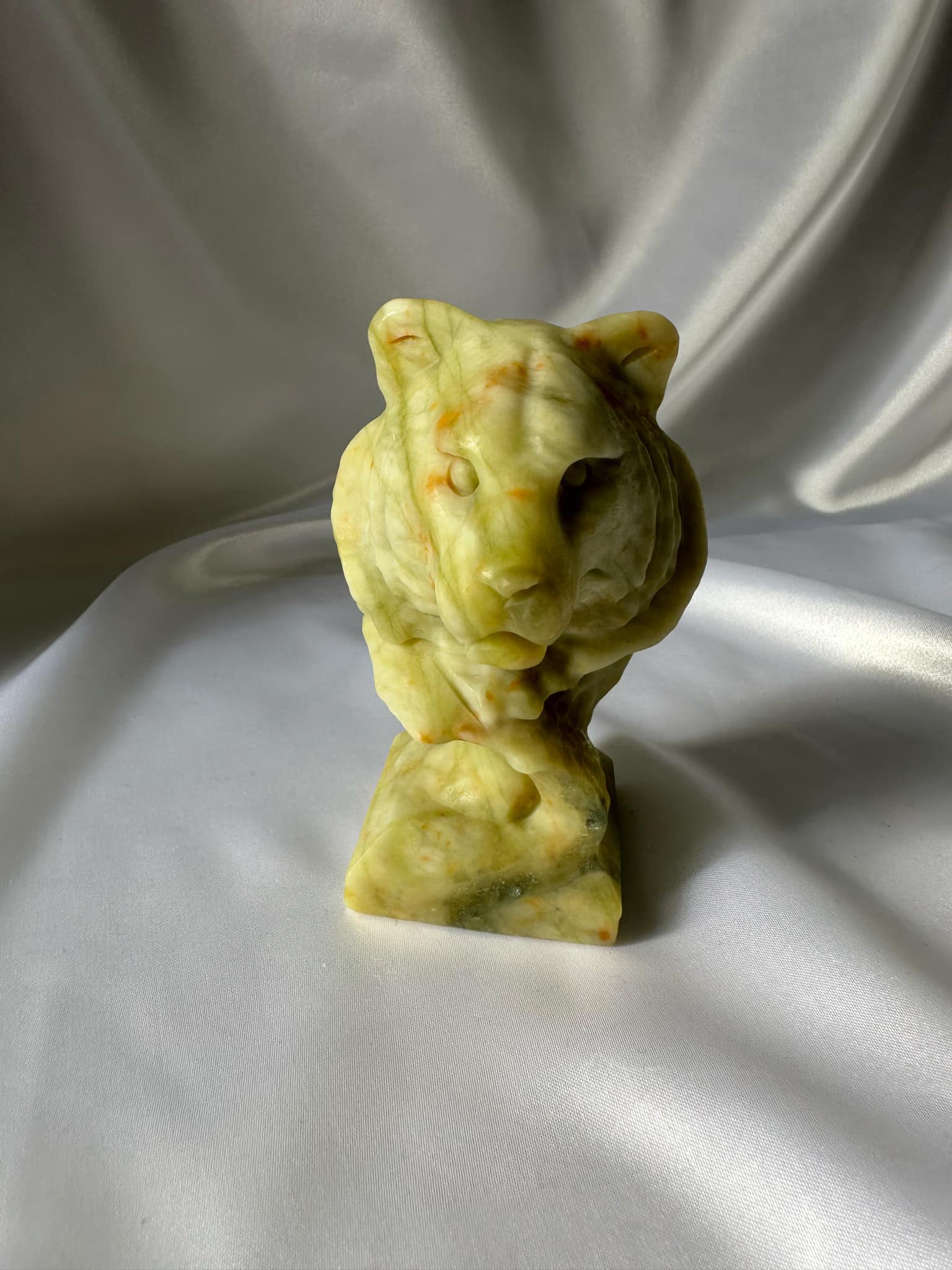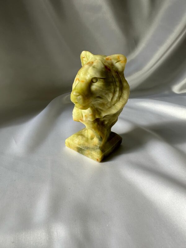 Lemon Jade Tiger Bust balances mood swings, enhances the understanding of dreams, as is believed to be the bringer of good luck. It is valued as a blood cleanser and for disorders of the nervous system.