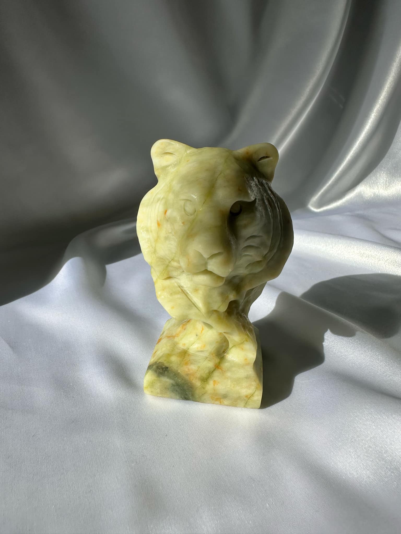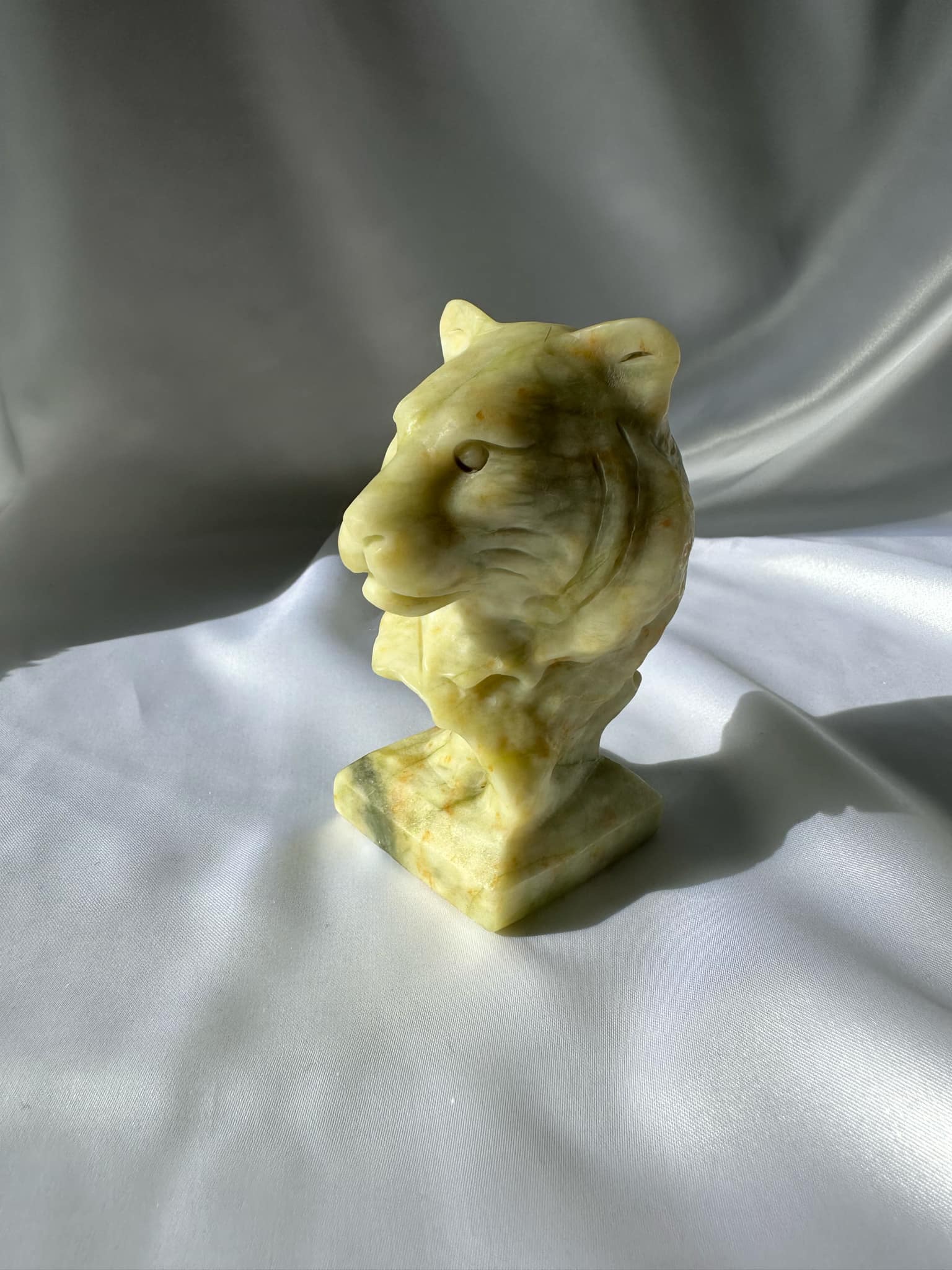 Lemon Jade Tiger Bust balances mood swings, enhances the understanding of dreams, as is believed to be the bringer of good luck. It is valued as a blood cleanser and for disorders of the nervous system.