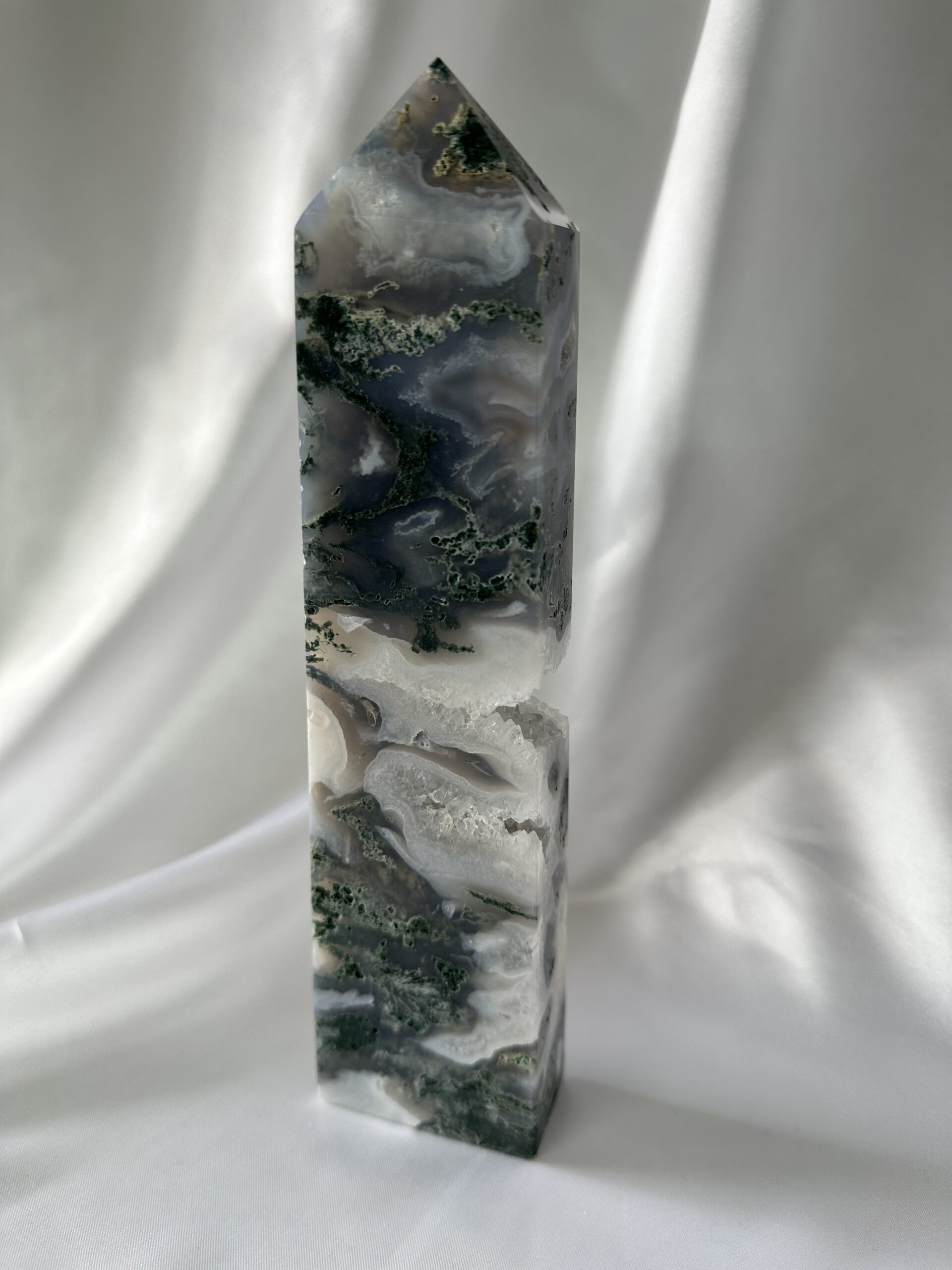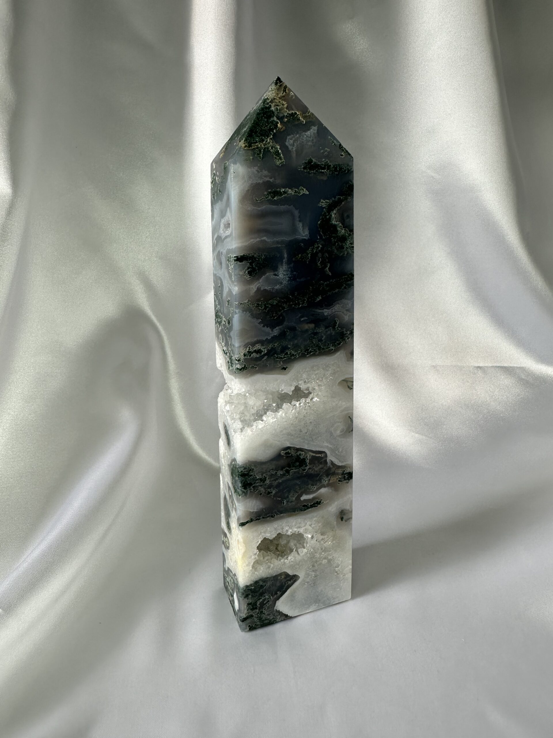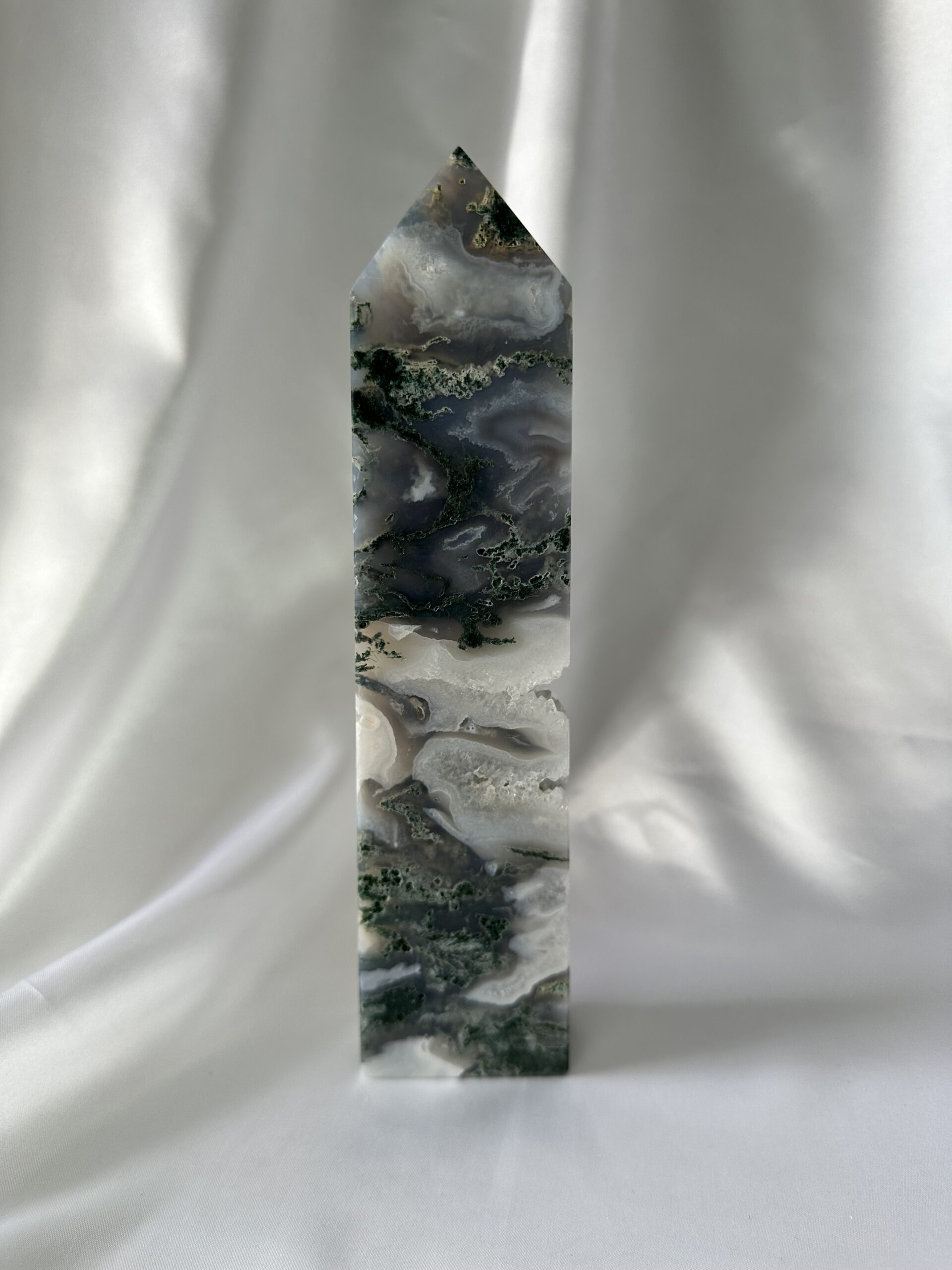 Moss Agate Tower promotes growth, stability, emotional balance, clarity, inner strength, and abundance. It is grounding, protective, and associated with the Earth and water elements.