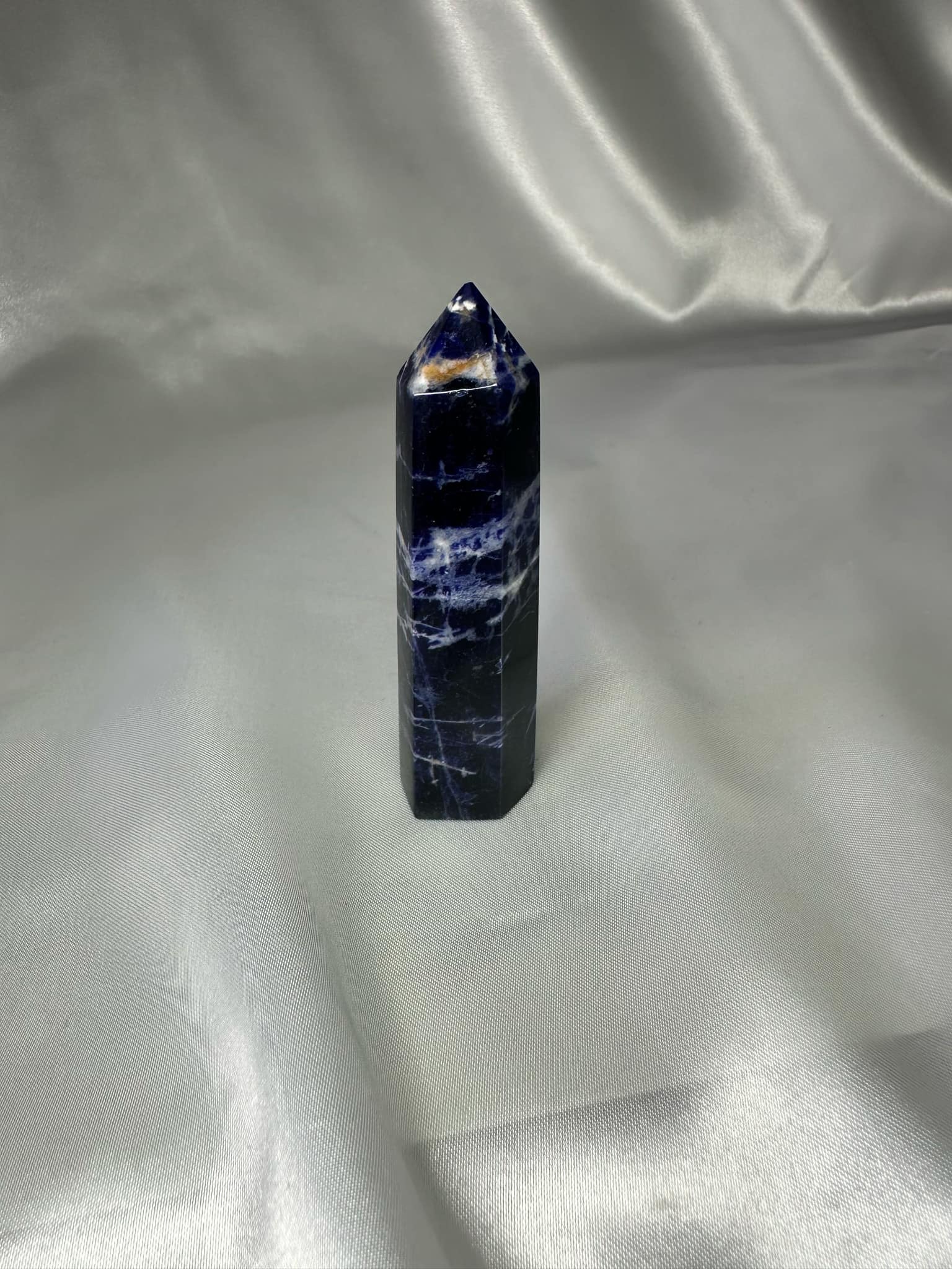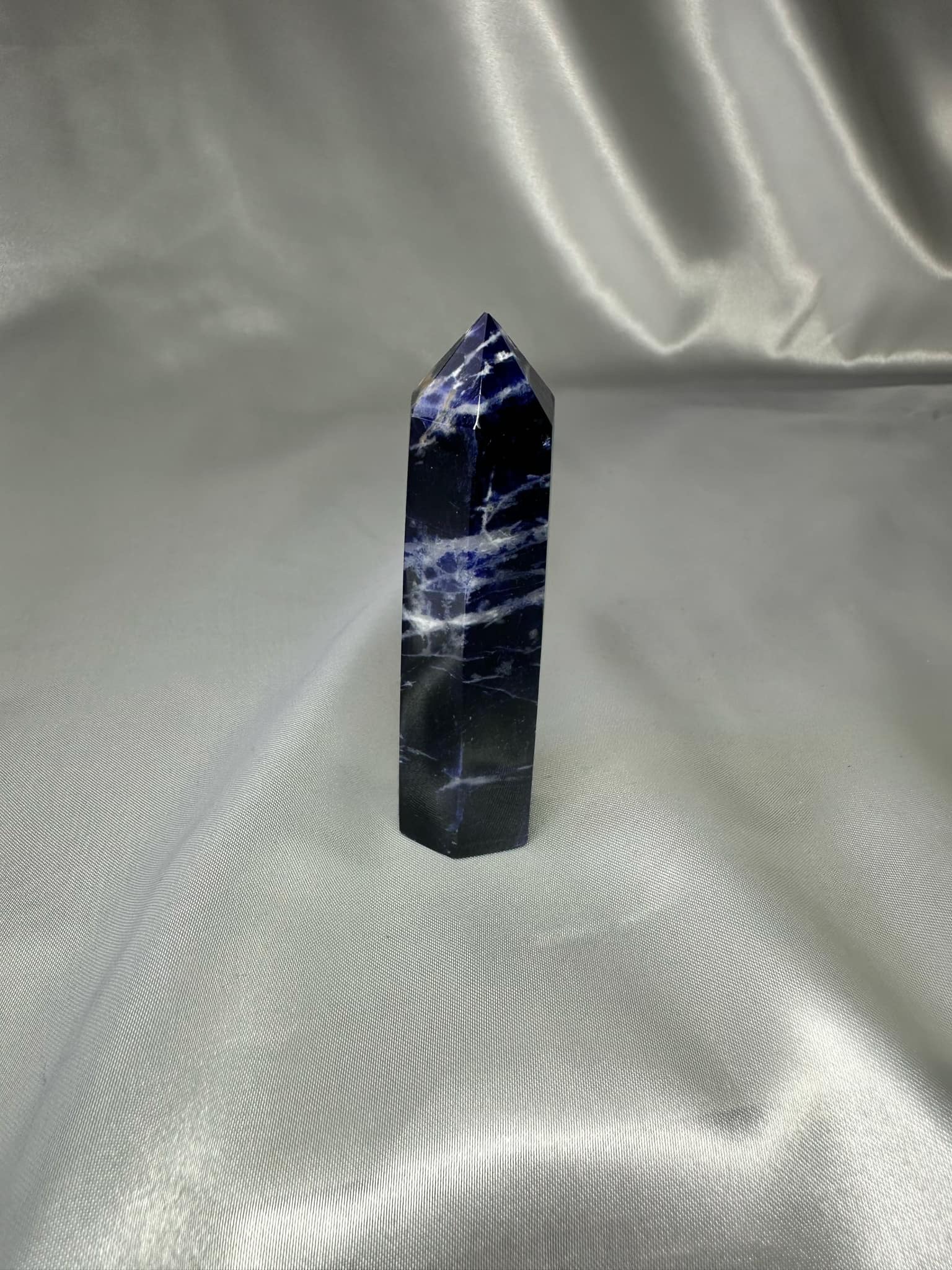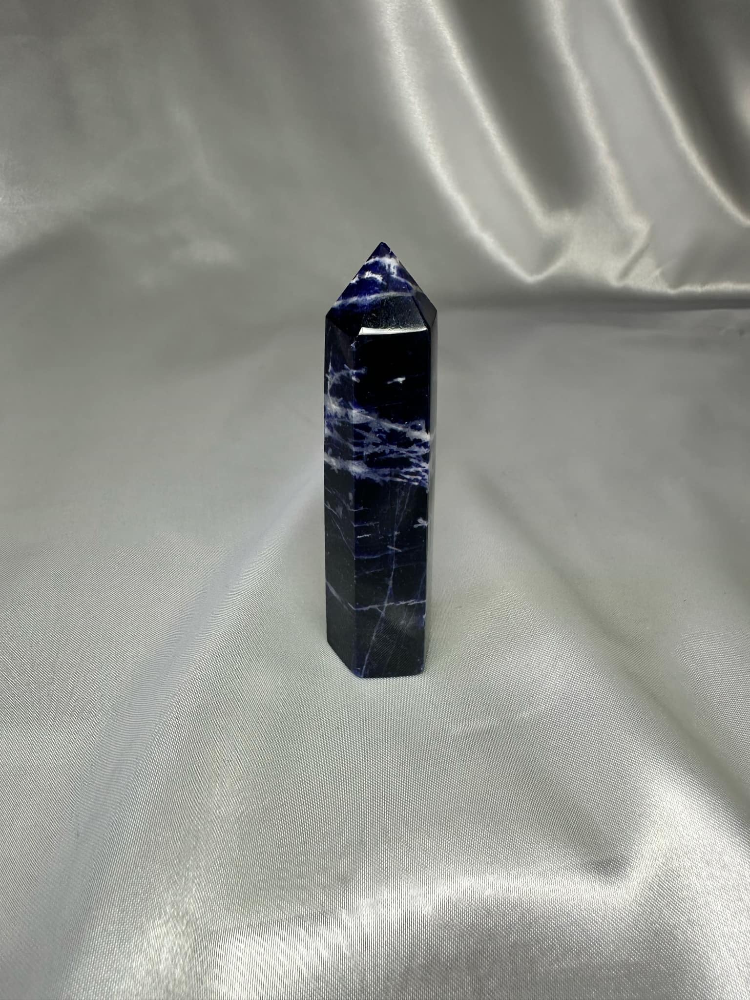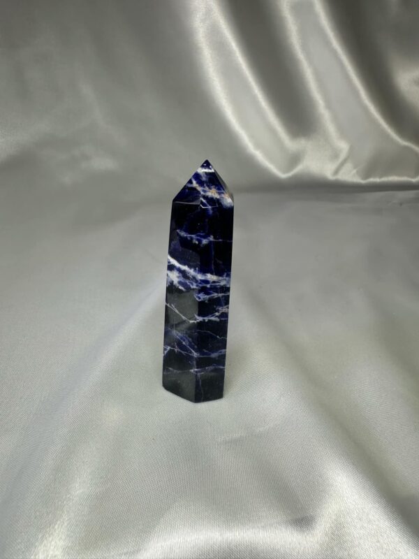 Sodalite Tower is traditionally associated with intellectualism and communication. It’s thought to improve clarity, self-expression, intuition, insight, wisdom, emotional stability, and calm.